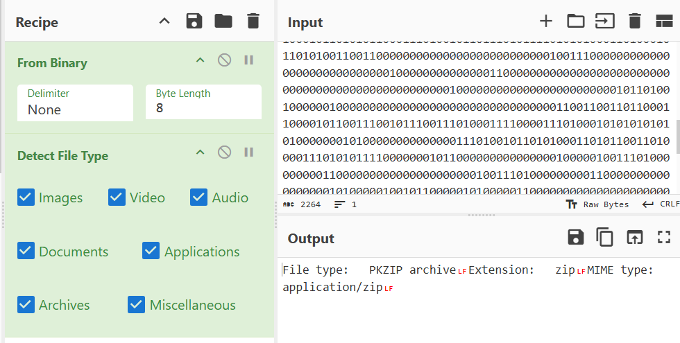 Using the 0 & 1’s as binary values led us to reconstruct a password protected .zip file.