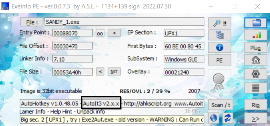 Using exeinfope indicates that the files is a AutoIt3 file, which is a Windows scripting language using to automate and simplify tasks.
